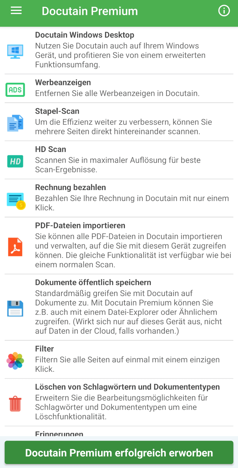 Sie haben die Möglichkeit erweiterte Funktionalitäten von Docutain im Rahmen eines Monats-oder Jahresabonnements "Docutain Premium" freizuschalten.