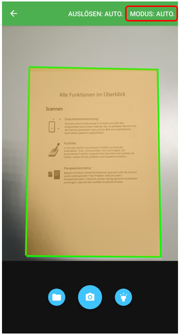 Scannen Sie Ihr Dokument. Im automatischen Modus wird Ihr Dokument automatisch erkannt und der optimale Zuschnitt mit einem grünen Rahmen markiert. Sobald der grüne Rahmen erscheint, wird das Dokument scharf gestellt und die Kamera löst automatisch aus.